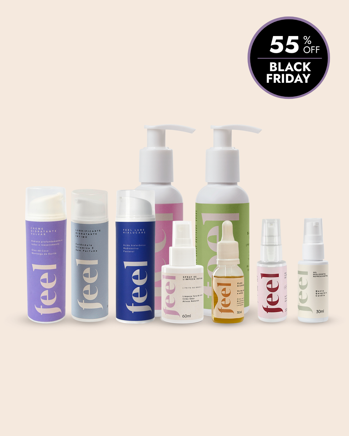 Do frescor diário ao estímulo mais intenso, o Kit Tudo reúne os 9 produtos mais amados da Feel em um  ritual. Ele cuida da sua higiene, hidrata profundamente, alivia desconfortos e ainda entrega sensações de prazer — tudo com fórmulas veganas, suaves e pensadas para cada fase do seu ciclo.