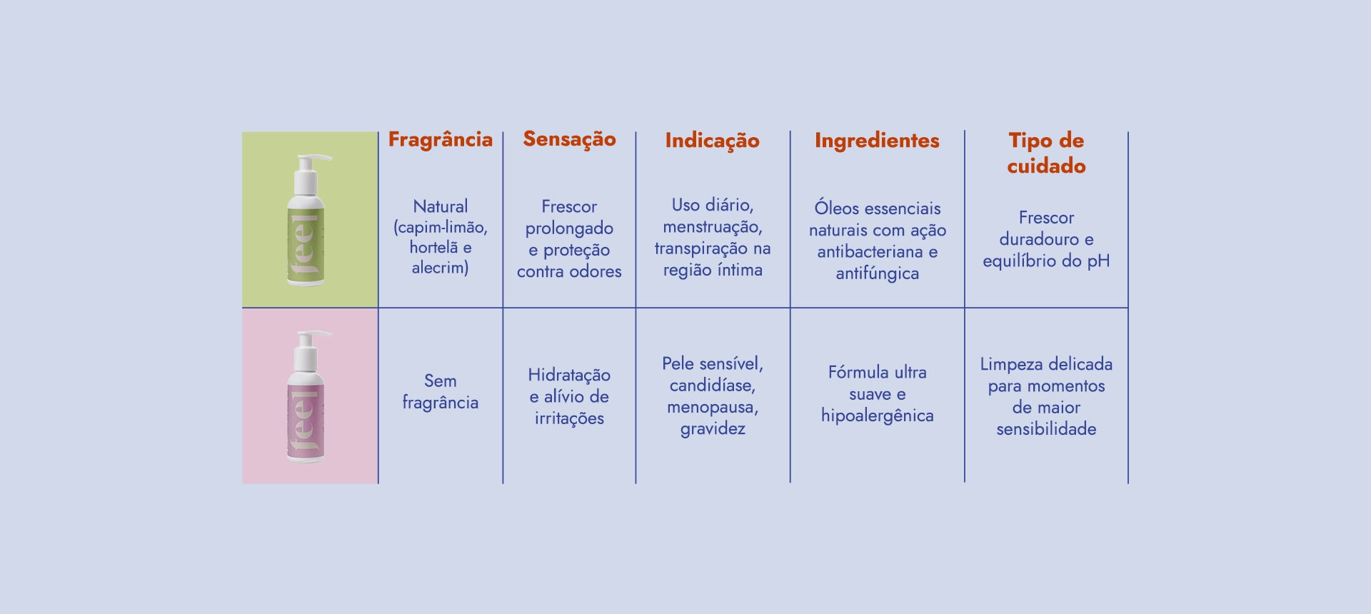 Sem Perfume: Indicado para peles extremamente sensíveis, gestantes, menopausa ou quem tem candidíase recorrente.