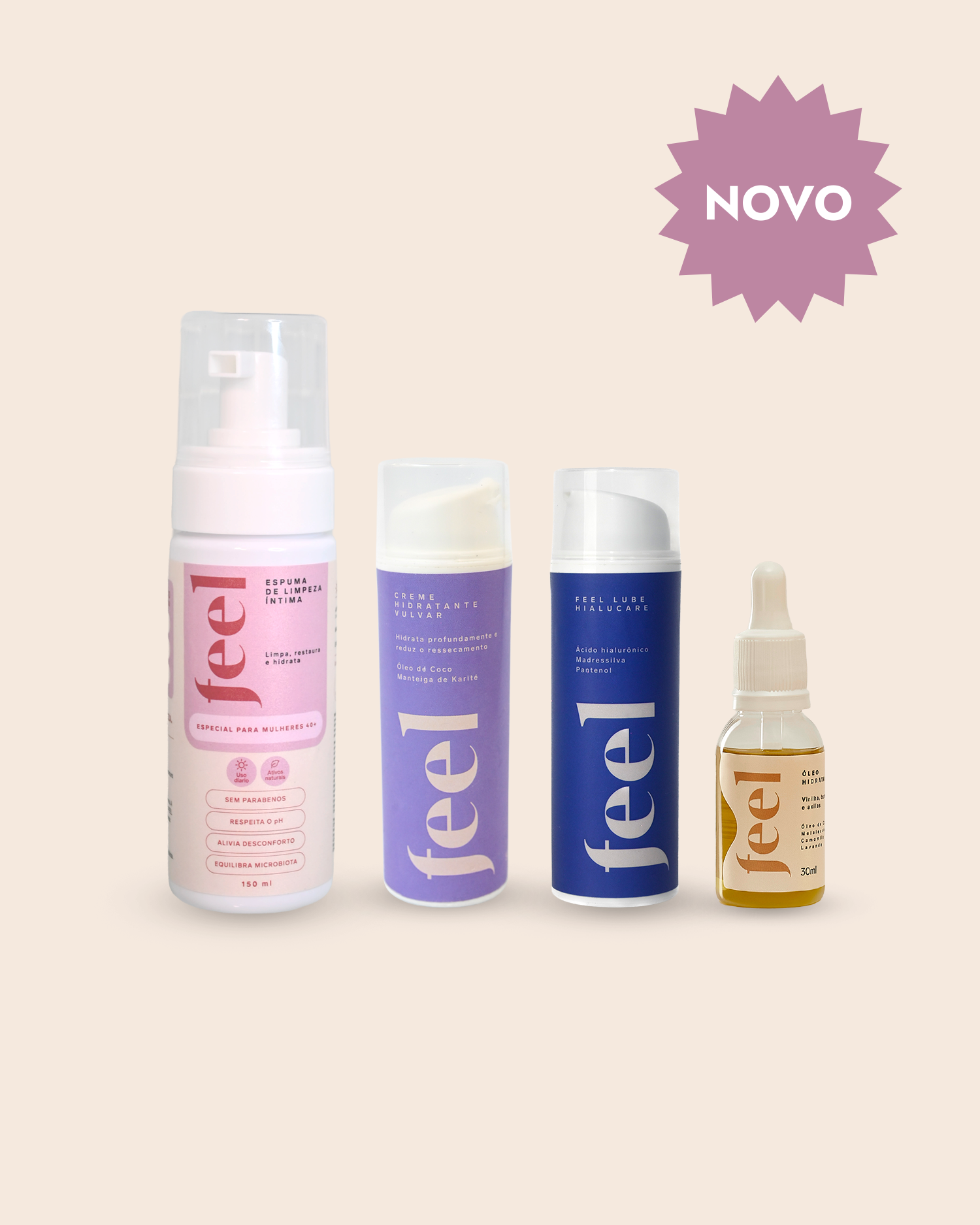 Reúne quatro fórmulas que atuam juntas em cada etapa do cuidado íntimo: espuma de limpeza íntima com pH equilibrado para o banho, nutrição e regeneração da pele, hidratação profunda e lubrificação confortável para a intimidade. Para quem não quer mais conviver com ressecamento, ardência, irritação ou dor — e quer recuperar o bem-estar e a confiança de uma vez.