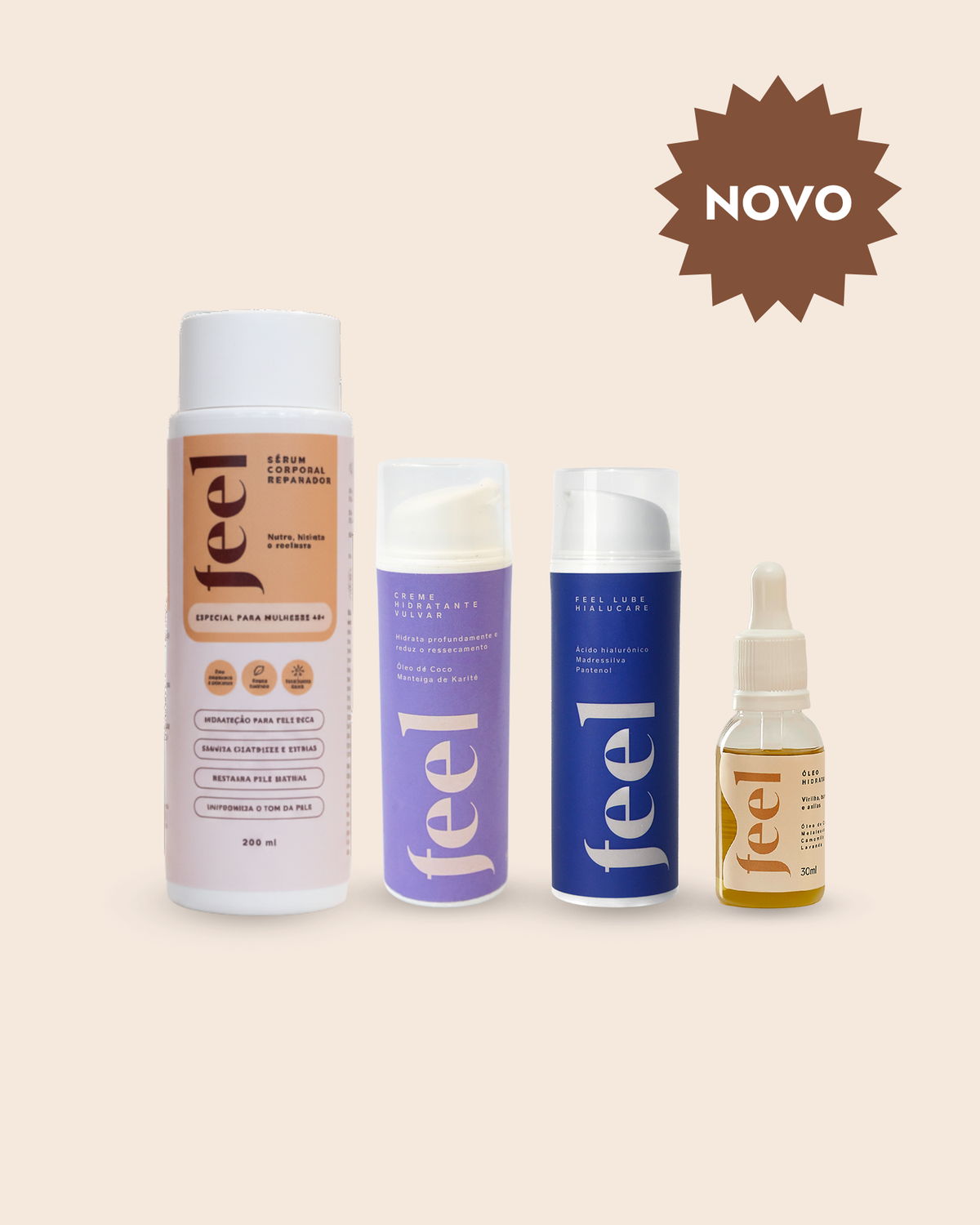 O Kit para ressecamento reúne os quatro produtos FEEL para cuidar do ressecamento na menopausa de forma completa.