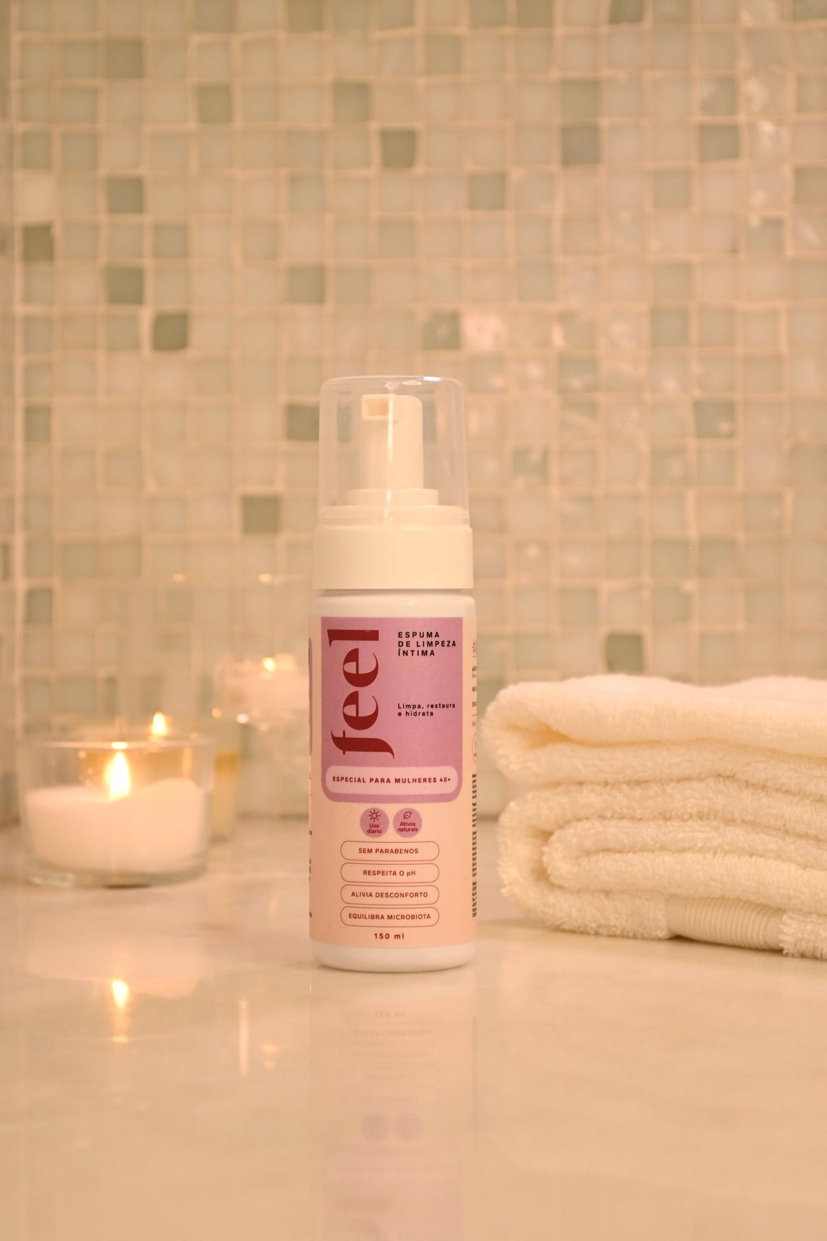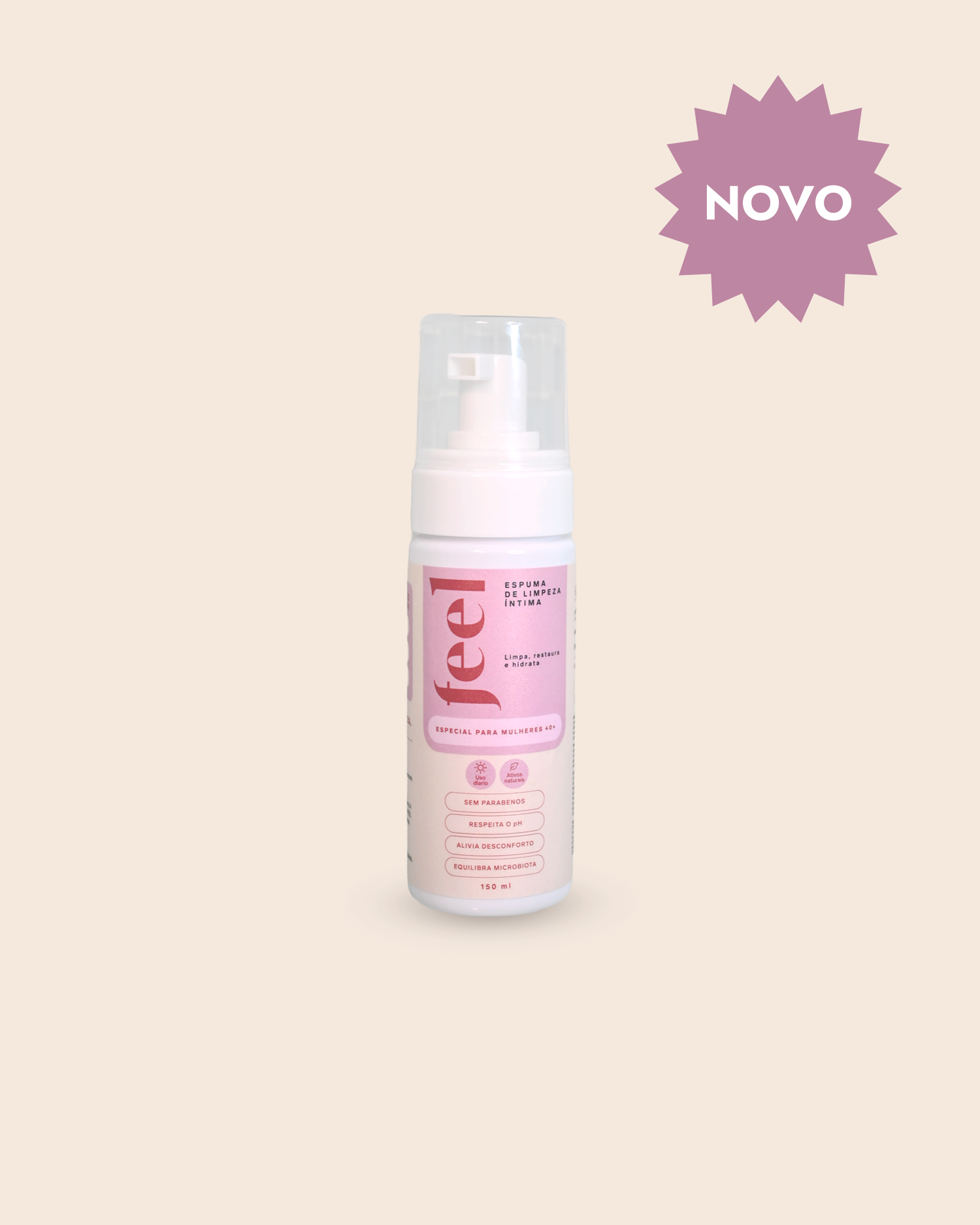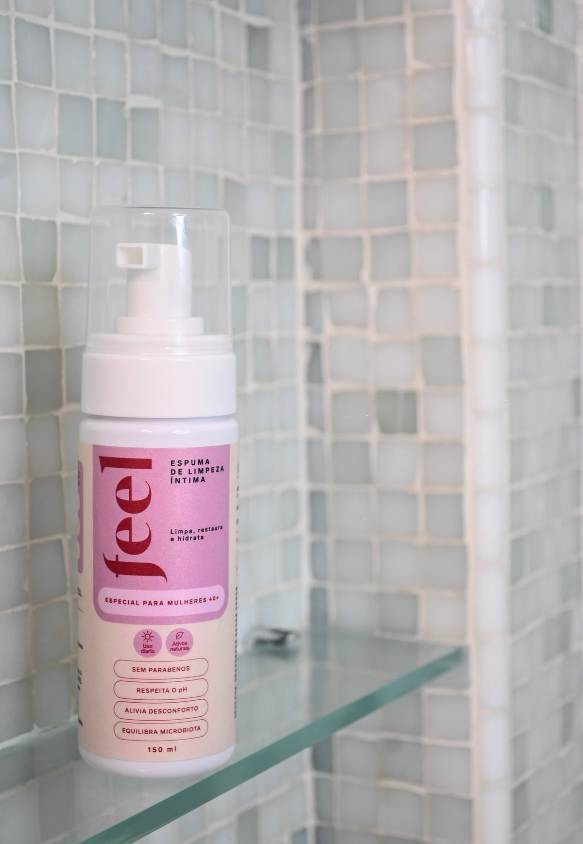 Com a queda do estrogênio, a pele íntima fica mais fina, seca e vulnerável. Os sabonetes comuns só limpam, não tratam. A Espuma FEEL faz os dois: limpa e restaura, todo dia, no banho.