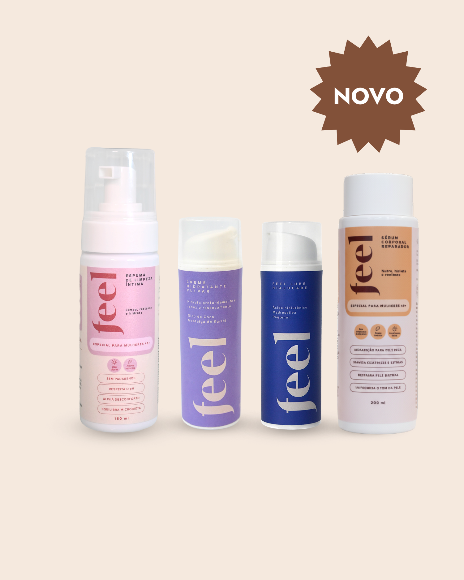 O Kit Ritual Total Menopausa reúne os quatro produtos FEEL para cada etapa do cuidado na menopausa. Este kit menopausa foi pensado para uma rotina mais completa, prática e consistente.